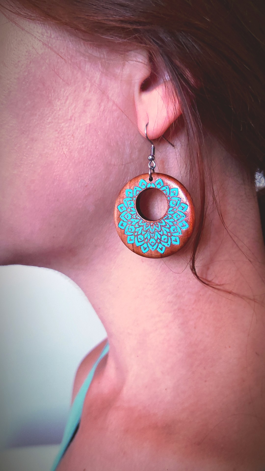 Krásné ručně vyráběné dřevěné visací náušnice. Stačí půl minuty na denním světle nebo pod umělým světlem (blesk foťáku telefonu) a naušnice ve tmě krásně září.