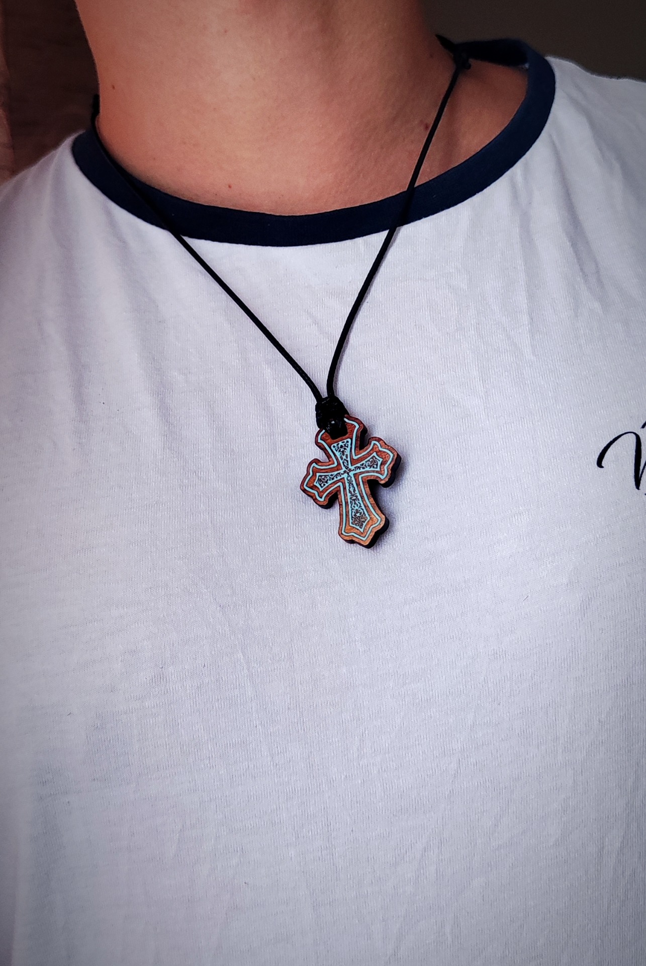 Krásný dřevěný křižek. Material - švestkové dřevo. Stačí pul minuty na dennim svetlě nebo umělé světlo (blesk mobilu) a křížek v noci krásně svítí.