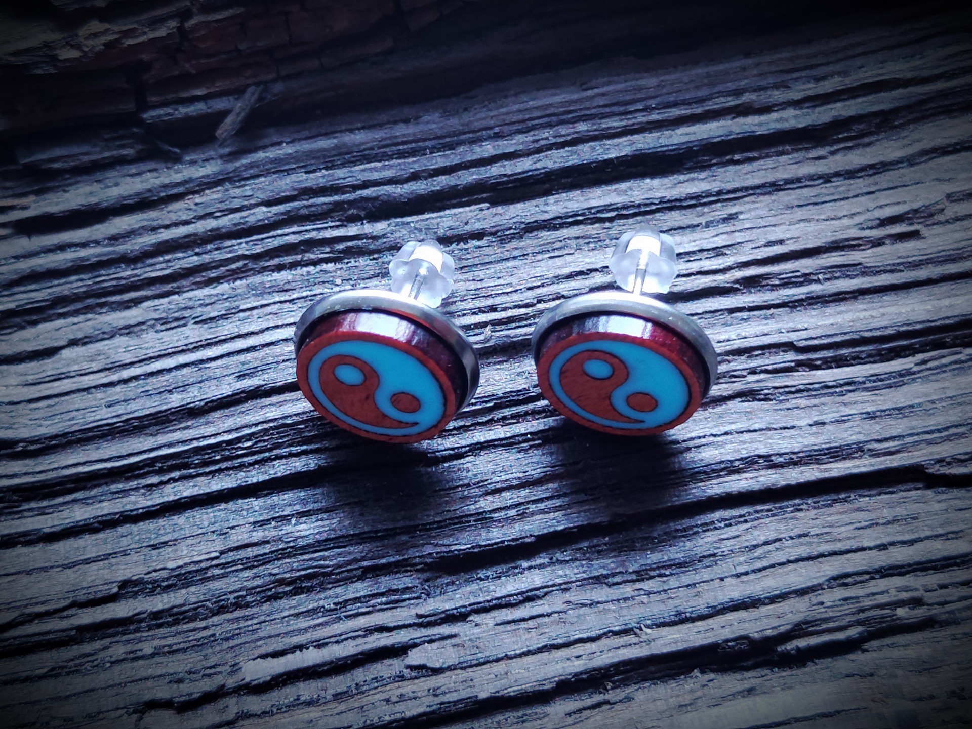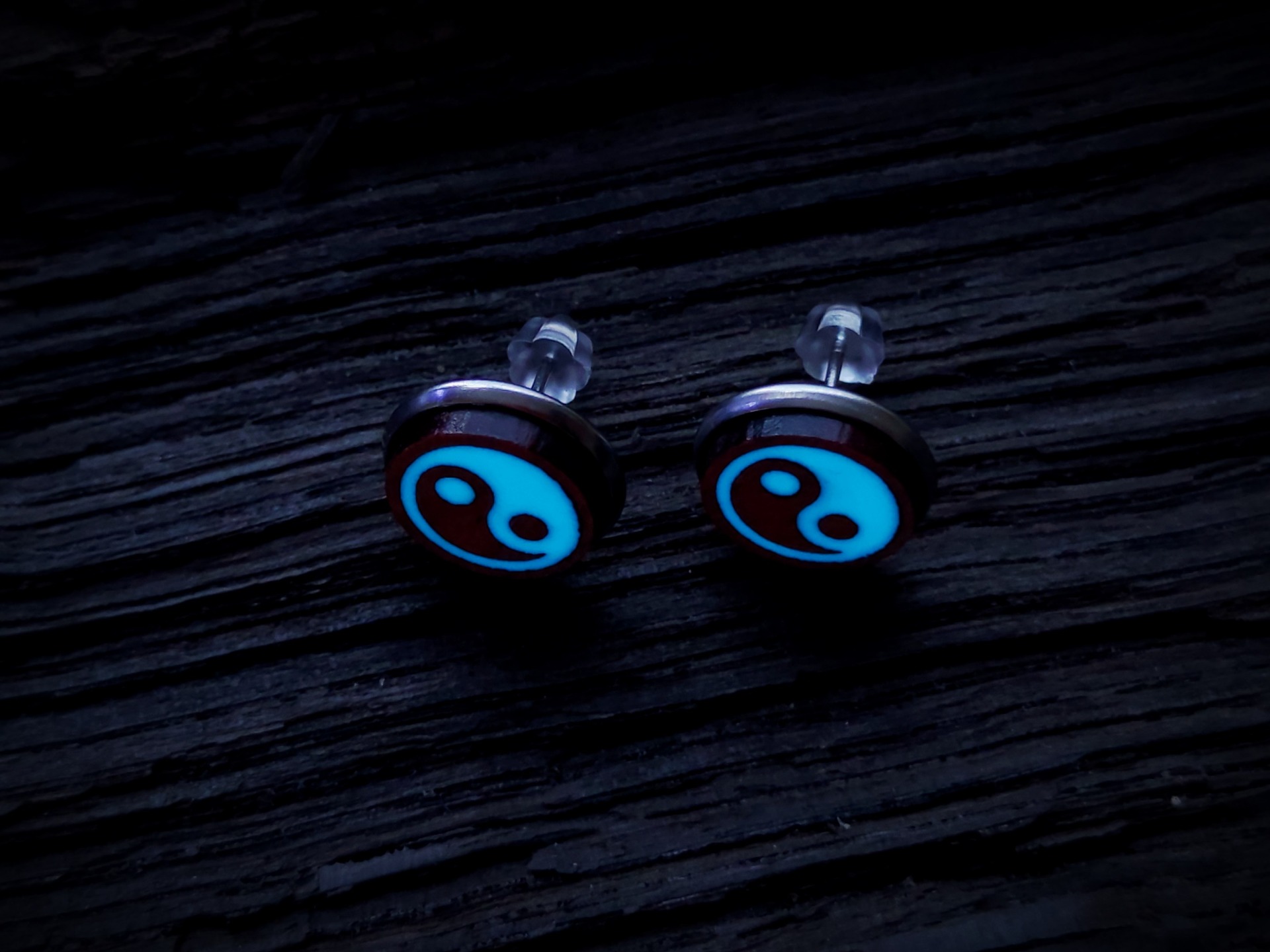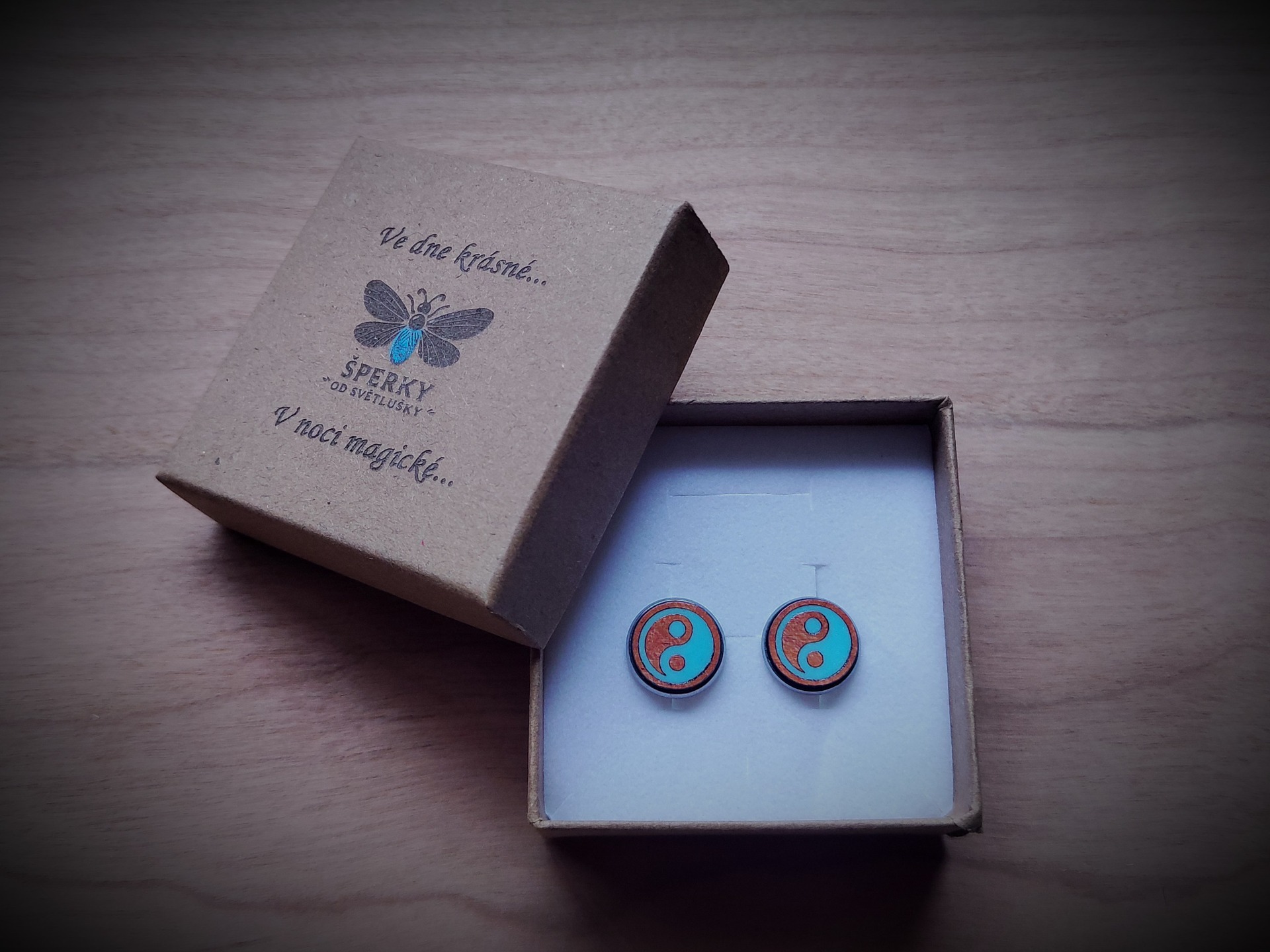 Krásné dřevěné naušnice styl pecka. Symbol jin jang. Stačí půl minuty na denním světle nebo pod umělým světlem (blesk foťáku telefonu) a naušnice ve tmě krásně září.